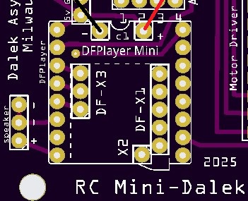 Insert the capacitor leads in pads labeled C1 near the DFplayer. Pay attention to polarity! It seems to fit well on top of board, under the DFplayer like the yellow board above. Optionally use dab of E6000 or doublesided tape to hold it in place.