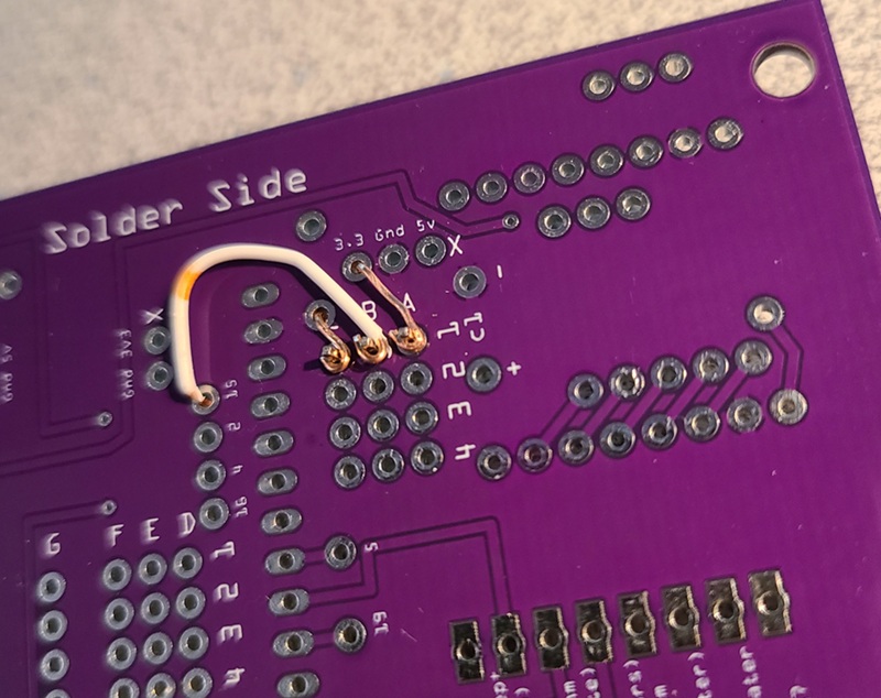 On top, connect wire from GND (near 6A) to A2, on bottom of board, bend wire and also solder to A3