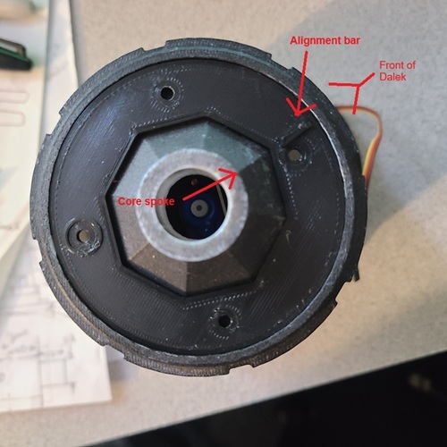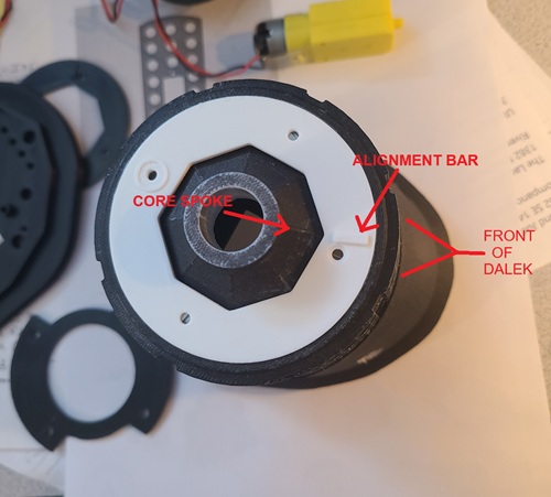 Insert the drilling alignment disk into the top of the core with the alignment bar toward the front of the Dalek. Press it all the way down, you might have to steer it a bit with the bar to make it sit flat.