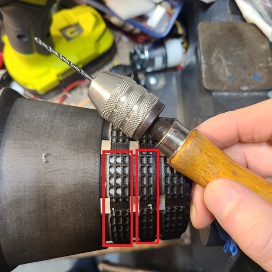 To have more control, I did this by hand (with a pin vise). First I pressed a scratch awl in the center of the indent. The makes a dimple to help the drill start cutting in the right place. When finished, I used a small rat-tail file to clean up the holes if they needed it. It took about 30-40 seconds per hole. Start with back holes in case you mess up. I drilled out all of the holes, all the way around that are inline with the red boxes (8 groups of 8 and 8 groups of 12).