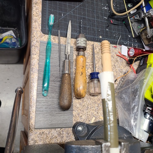 These are the tools that I used for this tedious task. Notice the wooden dowel wrapped with duct tape in the bench vise. I slid the core on this dowel to steady it while drilling.